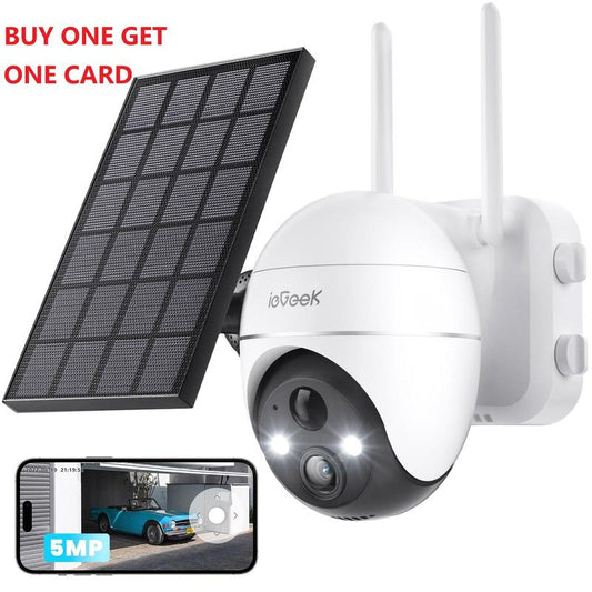 {Buy 1 Get 1 Card} Iegeek ZS-GX4S 5MP Battery Camera with Panel - Security Cameras Outdoor, Solar Cámara Wireless Wifi 360° PTZ Battery Powered with Spotlight & Siren/Motion Detection/Color Night Vision/2-Way Audio/Waterproof, Works with Alexa